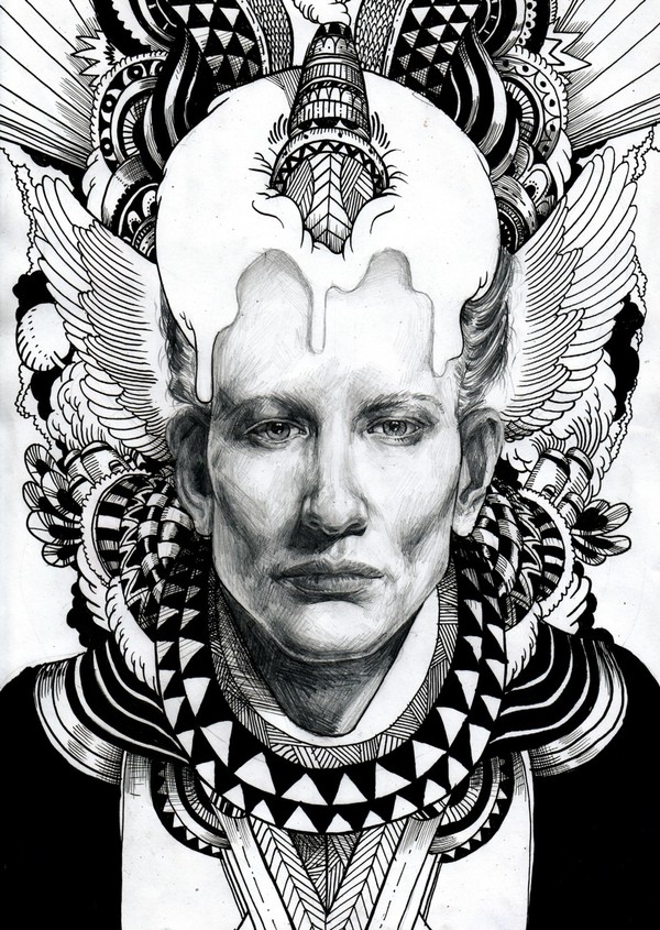 Tone of voice: MacArthur produces highly realistic black and white portraits, intervened by tribal patterning that repeats over certain areas to create a masking effect.